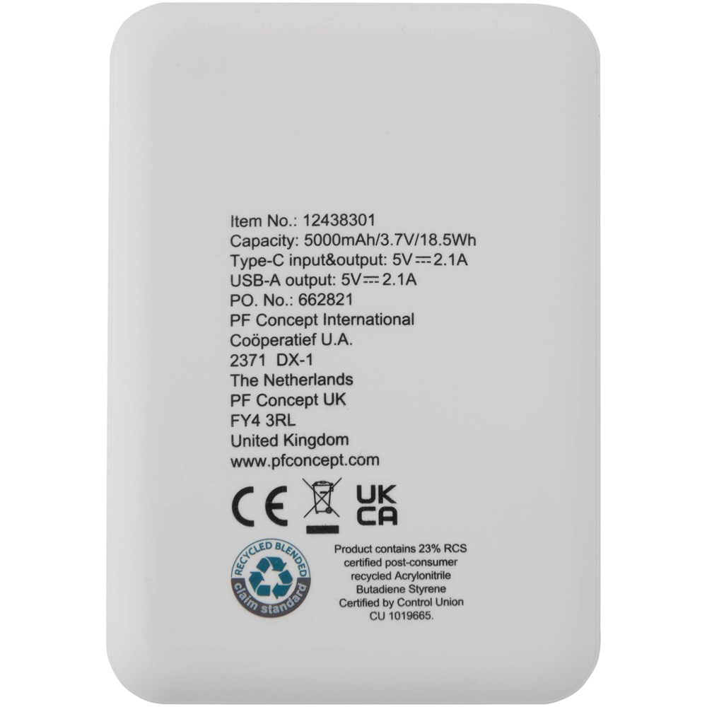 Powerbank met slank en elegant ontwerp en Type-C in/uitgangspoort en 2 x USB-A-poorten waardoor drie apparaten tegelijkertijd kunnen worden opgeladen. De powerbank heeft een 5000 mAh lithium-polymeerbatterij die een totaal uitgangsvermogen levert van max. 10 W. Deze powerbank is gemaakt van 23% RCS gecertificeerd gerecycled plastic. Geleverd met een TPE Type-C naar USB-A-oplaadkabel.