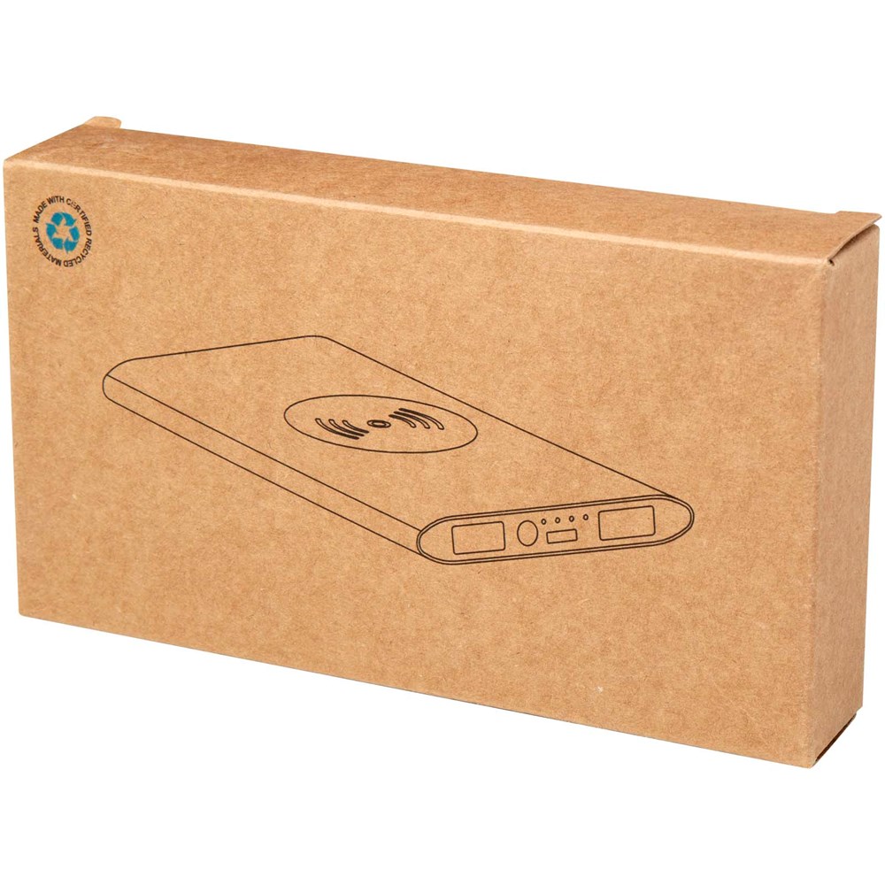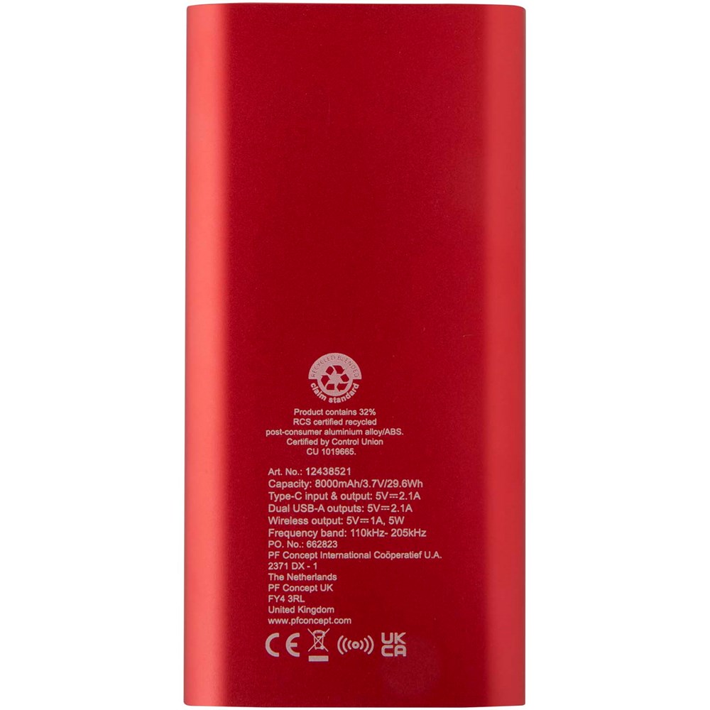 Powerbank met Type-C in/uitgangspoort en 2 x USB-A-poorten, wat betekent dat drie apparaten tegelijk kunnen worden opgeladen. Het ondersteunt ook 5 W draadloos opladen voor alle apparaten met Qi. De powerbank heeft een 8000 mAh lithium-polymeerbatterij die een totaal uitgangsvermogen levert van max. 10 W. Deze powerbank is gemaakt van 28% RCS gecertificeerd gerecycled plastic. Geleverd met een TPE Type-C naar USB-A-oplaadkabel.