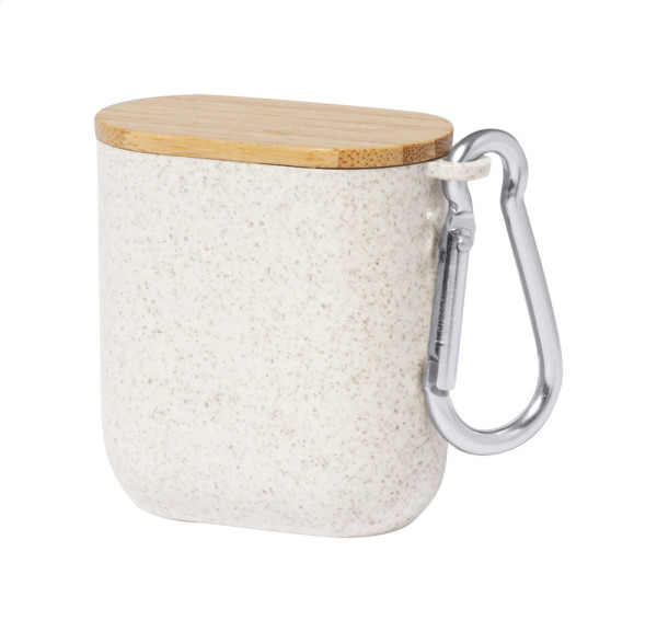USB-oplaadkabel in ecologisch kunststof hoesje van tarwestro met karabijnhaak en bamboe mobielhouderdeksel. Met micro-USB, USB-C en Lightning-aansluitingen. Met USB- en USB-C-ingangen.
