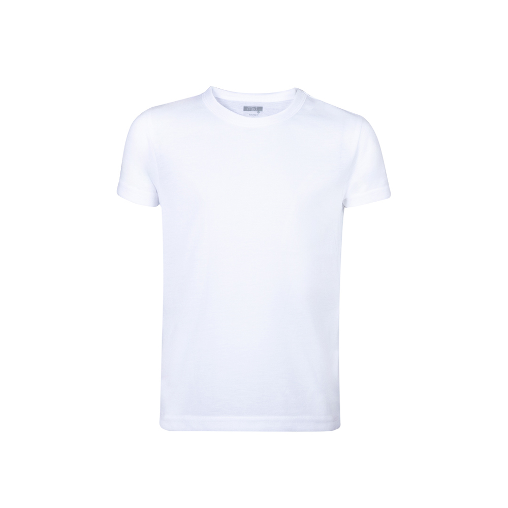 T-shirt voor kinderen van 100% ademend polyester van 140 g / m2 met katoenen textuur. speciaal ontworpen voor sublimatiedruk en beschikbaar in de maten 4-5,6-8,10-12.